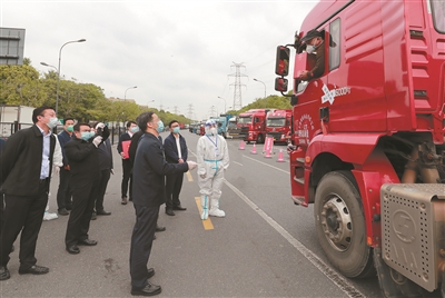 | 吕志良(中)嘱咐货车司机做好个人防护。 记者邹伟锋 摄 |