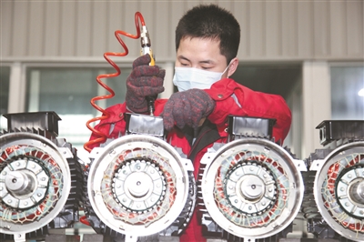 4月24日,位于台州市路桥区金清镇的浙江金龙电机股份有限公司生产车间内,该公司的青年职工正在生产线上开展电动机生产作业,赶制国内外订单。近年来,该公司坚持走国际国内双循环之路,不断推动企业高质量发展。通讯员蒋友青 摄