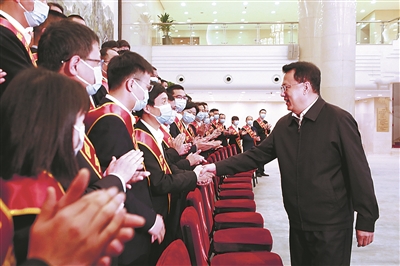 | 昨日上午,我省举行2022年庆祝“五一”国际劳动节暨劳模先进代表座谈会,省委书记袁家军(右)亲切接见受表彰的劳模先进代表。 记者邹伟锋 摄 |