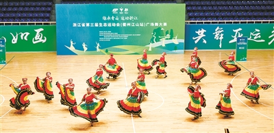 5月28日下午,衢州江山市体育馆。参加浙江省第三届生态运动会(衢州江山站)广场舞大赛的运动员在比赛。