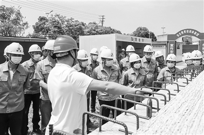 5月31日,磐安县盘峰乡所属的浙江新鼎环境建设有限公司的安全监理人员正在为建筑工地上项目经理及管理骨干讲解安全知识。