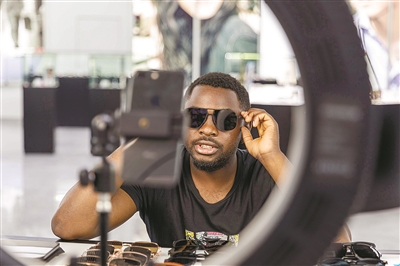6月1日,在温州市瓯海区眼镜跨境电商园展区的直播间,来自温州医科大学茶山校区的南非留学生Hilton,通过跨境直播平台,向全球客户展示温州的眼镜产品。