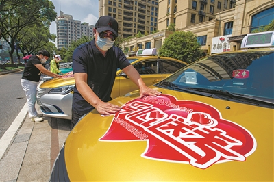 昨日,金华市区街头,出租车司机在车身贴上“爱心送考”标志后集体出发。当天,金华市2022年“爱心送考”活动正式启动。