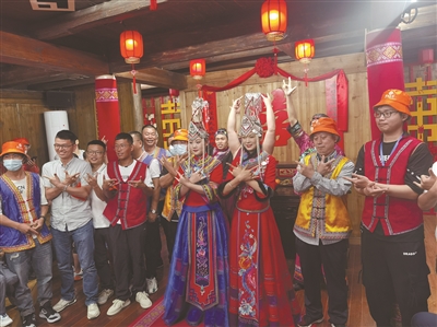 这一趟疗休养之行,赵鹏体验了一把畲乡新郎。这个年轻的小伙子是浙江隧道工程集团有限公司的一名技术员,来到景宁后,听说可以参加畲乡婚俗体验活动,便积极报名参加。“第一次穿上花色鲜艳畲族婚服,心里有点小得意,感觉自己变帅了一些。”他半开玩笑地说。在接下来的婚俗体验环节中,他和两名“伴郎”为了见到“新娘”可谓是“过五关斩六将”,要经过重重考验,才能“娶”新娘。“门口第一关就是猜谜,猜错了还得喝酒,我和伴郎简直挖空心思作答,周围也有很多帮我们的人,场面特别热闹,大家玩得特别开心。”他觉得整个经历都特别珍贵,仿佛体会到“另一种生活”,那是一种返璞归真的快乐。
