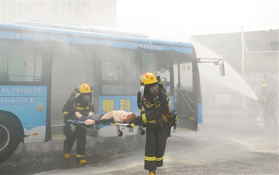 为深入开展第21个全国“安全生产月”活动,昨日,东阳市交通运输局、东阳市交通投资建设集团有限公司会同东阳市消防救援大队、东阳市公安局白云派出所等单位,联合开展消防、反恐、疫情突发事件应急处置综合演练。图为消防队员将“伤员”抬下车。