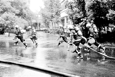 日前,在衢州市第三届职工技能运动会上,衢州市消防救援支队在智造新城国网衢州供电公司职工文体活动中心,冒着大雨进行消防机动双轮异向切割锯组装测试竞赛和消防枪炮协同操竞赛。图为消防队员在技能比武中的情景。