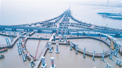 | 图为目前在建的亚洲最大海上互通——杭甬复线宁波一期项目滨海互通施工现场。 通讯员施蕾蕾 摄 |