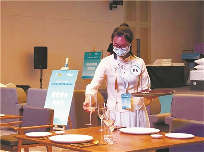 | 选手正认真进行餐饮摆台。 王一堡 摄 |