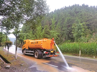 6月21日,开化城白线12K+700路段,公路部门的养护人员正忙着冲洗、清理洪灾过后路面上遗留下来的淤泥、碎石、土石渣等,以尽快恢复道路整洁和畅通。