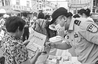 近日,台州市公安局椒江分局章安派出所民警走上街头,通过摆放宣传展板、发放宣传资料、现场讲解等方式,向群众讲解防骗、防盗、防火、防交通事故、防毒品等知识。