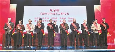| 向党龄超过50年的劳模代表颁发纪念奖杯。 |
