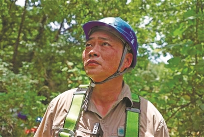 戴好安全帽后,老杨用工作服把自己裹得严严实实,他套上一双作业手套,扛着10多公斤的装备开始攀爬铁塔。此时,烈日已经打卡上班,站在树荫下都是酷热难当,而老杨要迎着烈日攀爬被灼烧得火热的铁塔,其中滋味可想而知。