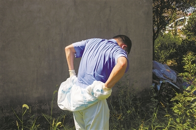 黄岩区连日高温,白天温度基本都超过40℃,阳光下更是酷热,法医陈其穿上防护服,只是一会儿,他就感觉防护服里的警服已经湿透,但是他顾不上这些,专心地工作着。