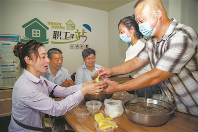 连日来,持续高温天气,金华市企事业单位工会组织送清凉到基层职工驿站,让一线户外劳动者在清凉港湾里安心休息,确保安全度夏。图为昨日,在金华市交投公交集团客运金东公司清凉舒适的职工驿站里,一线公交司乘人员在工余时间品尝冷饮,纳凉休息。通讯员胡肖飞 摄