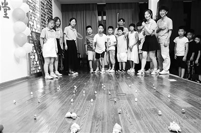 图为“小候鸟”们在支教小老师的带领下玩“套圈圈”小游戏,过快乐暑假。