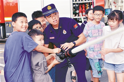昨日,衢州市常山县消防救援大队“蓝焰U+”青年志愿服务队深入辖区芳村、球川等多个乡镇文化礼堂,组织留守儿童开展暑期消防安全专项教育系列活动。图为消防救援人员指导留守儿童体验水枪出水灭火。