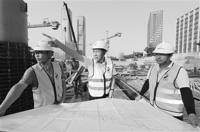 | 刘志坚(中)与带班班长讨论施工中的问题。记者邹伟锋 摄 |