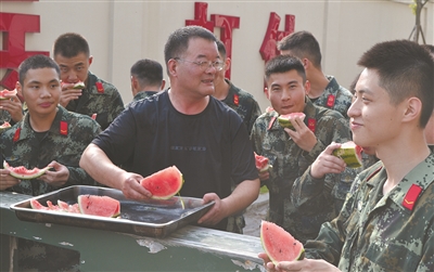 | 江国政把西瓜等防暑降温物品送到训练场,慰问高温下挥洒汗水的战士们。 |