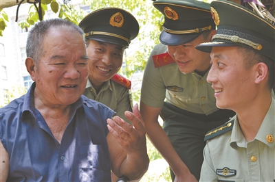 | “八一”建军节前夕,武警台州支队温岭中队官兵来到江杏林家中,听江老伯讲述军民鱼水情的故事。 |