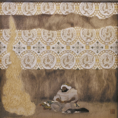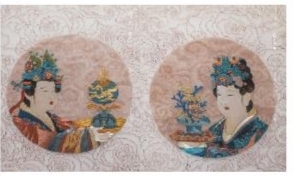 | 师徒合作作品 《单面绣朝元图·奉宝玉女、捧灵芝玉女壁挂》金家虹 金冬 展品介绍: 《单面绣丝路锦绣系列壁挂》作品运用了打籽绣、盘金绣、纳纱绣等技法完成。值得一提的是,画面中一团火的图案是用一根完整的金线盘定而成,从起始到结束在同一个点上,并且绣线不穿过绣布。画面中最细致的部分,用的是“一丝”绣线,正常一根丝线是“六丝”,头发丝的粗细差不多是“六丝”,这样对比一下,绣制难度可想而知。《单面绣朝元图·奉宝玉女、捧灵芝玉女壁挂》作品,在创作时,细节方面都很有讲究,比如运用锁绣的针法绣制时,每一针的针脚长度需要注意,绣制花费了一年左右的时间。 |