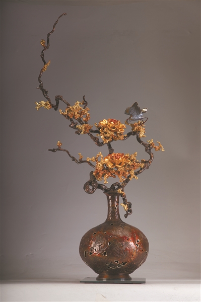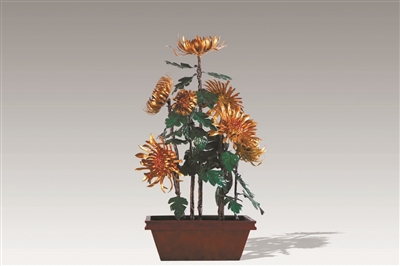 | 展品介绍: 《喜韵千祥》作品重在“韵”,结合了宋代的审美和艺术态度,也结合了现代的工艺和表现手法,极简的器型和熔铜的技法互相碰撞,打造了集传统传承和现代创新于一体的全新艺术作品。因为铜有很多种类,如紫铜、黄铜、白铜、青铜等,不同的铜有不同的属性,所以要去感受其中的属性。因为每个人的手型大小不同、使用习惯不同、力度不同等,还要用心感受工具的特征。还有自身的感受、作品的感受、文化的感受、欣赏者的感受、时代的感受、责任的感受等,每领悟一次就要下很大精力。 《金菊流彩》 王坚 |
