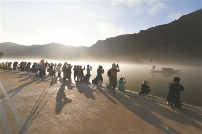 昨日清晨,在建德市新安江畔溪头段的江面上,下涯镇渔夫唐玲珑夫妻在江面上表演捕鱼、撒网、拉网、渔归等劳作场景的动作,在飘渺的江雾中时隐时现,美轮美奂,景致如画,引得众多游客和摄影爱好者频频按下快门, 赢得阵阵喝彩,也成了夏季江畔一道亮丽的风景。 通讯员宁文武 摄