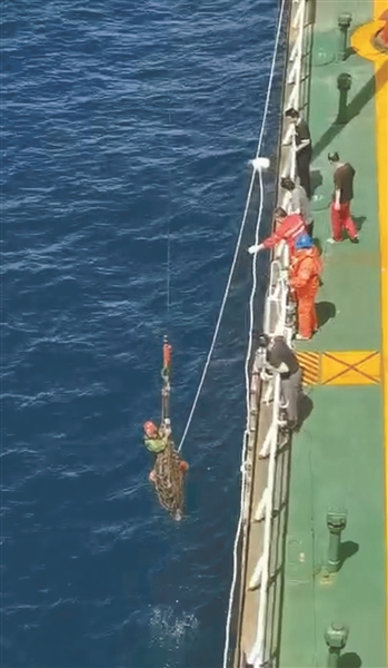 “上来了!”“抓住啊!”在甲板上多名船员呼喊中,第一名落水者“乘坐”网兜平安到达甲板。