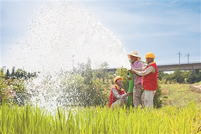 8月16日,在金华市婺城区蒋堂镇下汪村,随着国网金华婺城供电分公司红船党员服务队队员合上开关,一股股清澈的水流洒向田间。