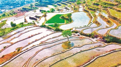 在覆卮山的“千年梯田”极目远眺,从山腰铺泻而下又从山脚叠层而上的田块,构成了一幅奇诡壮丽的图画。覆卮山北彼石浪周围连成片的梯田有二千三百多亩,按每亩大约十块梯田计算共有梯田约二万三千多块,这些梯田全部由第四纪冰川遗迹——“石冰川”中的岩块砌筑而成。一年四季美景不同,三四月份是油菜花梯田,五六月份是镜面梯田,九十月份是秋收一片金黄,十二月份是梯田雪景。
