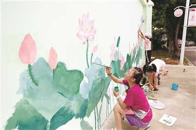 昨日,在台州市路桥区路桥街道永跃村,擅长作画的学生在绘制清廉墙画。