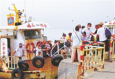 今年第11号超强台风来势汹汹,为防范“轩岚诺”带来的不安全,昨日,游客们在景区工作人员的劝导下,先后安全有序地从玉环大鹿岛和鸡山岛、洋屿岛撤离。图为游客乘坐客渡船回到内陆栈头码头。