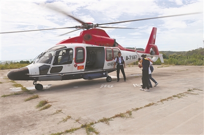 9月3日上午,台风天,舟山市嵊泗县枸杞乡政府协调海丰通航,派遣直升机救援岛上一患者。通讯员孙丹飞、林上军 摄