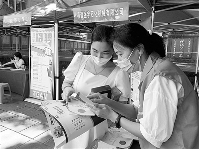 图为工会工作人员耐心地向求职者讲解《工会法》。