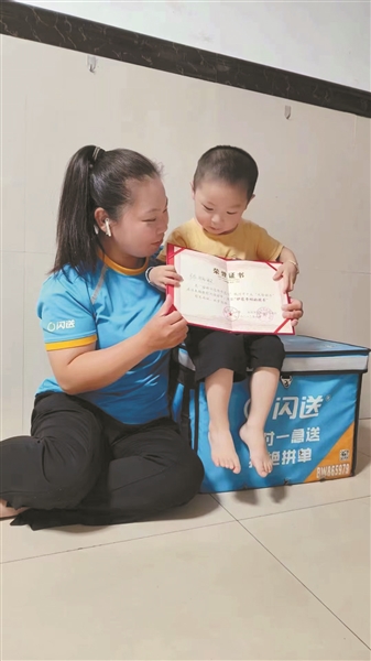 2020年11月,张雅敏背上不满周岁的儿子当起了闪送骑士。那会的早晨已有凉意,她一般会在早上10点多出门,“我尽量吃饱点,把午饭省下来。”冬天比较难熬,即便出门晚,儿子被裹得严严实实,但迎面而来的寒风还是让人冻得受不了。不过这些,张雅敏几乎不提及,她说得最多的是客户对她和儿子的善意,“有一次儿子睡着了,我只能让客户下楼拿件。对方不仅没有埋怨,还给了打赏。”“儿子跟我出来跑得多了,不太认生,经常会主动跟客户打招呼,大家都很喜欢他,常常送他水果、小玩具等礼物。”