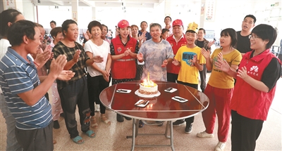 9月14日,在温岭市新河镇中学的台风避灾点里,镇非公党组织联合曙光义工采购了蛋糕,给这里的一老一少——外来务工人员及子女,过了一个特殊的生日,让他们感受到不一样的暖心关怀。