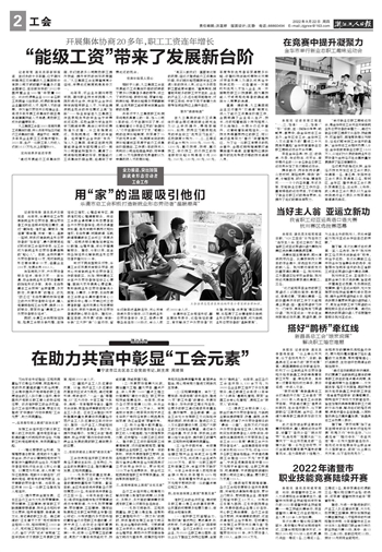 (三)重视产业工人队伍建设改革。以省、市产业工人队伍建设改革在我区试点为契机,通过党建引领、师徒结对、“一企一品”等措施,以“五大行动、十百工程”为抓手,造就一支有理想守信念、懂技术会创新、敢担当讲奉献的庞大产业工人队伍。区总工会推出《关于助推高质量发展建设共同富裕示范产业工人队伍建设三年行动计划》,推动一线产业工人技能培训和晋级,使劳动者具备一技之长,提升技能等级。发挥工会在“稳进提质、助企纾困”等行动中的作用,使企业发展的同时职工得到更多的实惠。