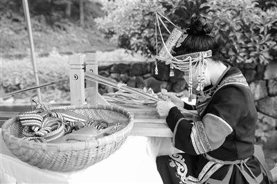 | 身穿畲族传统服饰的涂国佳展示编织彩带技术。 |