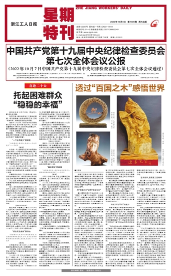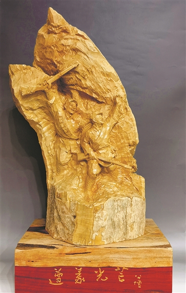 高公博也用充满温度的刀法“诉说”着人间美好。作品《企鹅故事》取材巴西苏木,刻画企鹅带着全家来看望老人、老人扑地而迎的感人瞬间。高公博介绍,这其实是一个老人与企鹅的故事——2011年,巴西一位老人救下了一只濒死的企鹅,随后将它放归海里,没想到,此后的每一年,企鹅都会游约8047千米回来看他,与他亲密地相处8个月再离开。“这个故事打动了我,因此,我想把企鹅奔向老人、老人高兴伸出双手的瞬间永远定格,也是希望人与自然和睦相处。”