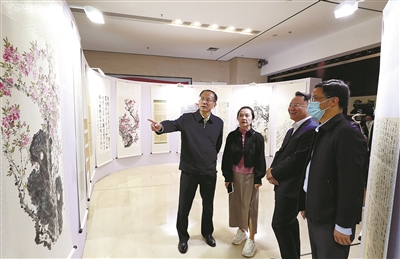| 史济锡(左一)观摩书画展。 记者邹伟锋 摄 |