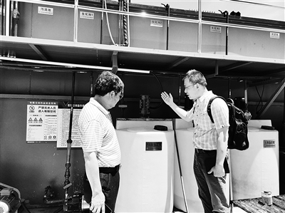 | “环保管家”(右)向企业人员讲解废水处理站加药的知识。通讯员梅琳 摄 |