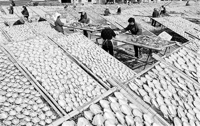 松门镇是浙江省“鱼鲞之乡”。松门白鲞“腌得咸,洗得淡,晒得干,色淡黄,味臻美”,以其外观悦人眼目、品质良好诱人和风味独特鲜美深受消费者欢迎,畅销国内市场,晾晒鱼鲞也成为助力当地农民增收的一项重要产业。通讯员刘振清 摄