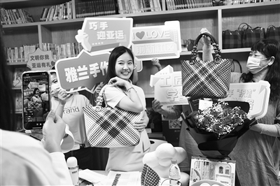 一次偶然的机会,有热心居民看中雅兰手作社的编织包,当即以120元的价格买下,这让社团发现了爱好背后的潜在商机。为扩大雅兰手作社的知名度,拓宽创收渠道,雅兰手作社成员集体自学抖音拍摄、网络直播。