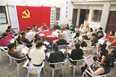 昨日,桐庐县桐君街道迎春社区“天井圆桌会”上,“楼下书记”、楼道长以及居民代表通过报纸学习党的二十大报告内容。