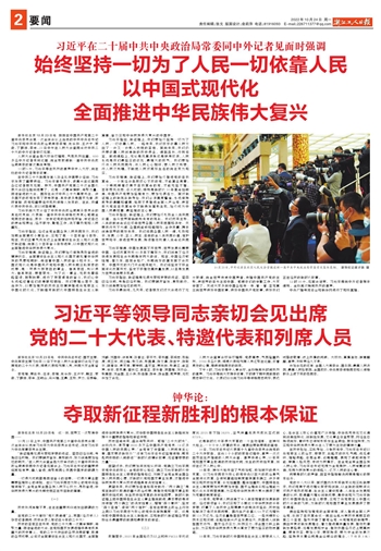 新华社北京10月23日电 刚刚在中国共产党第二十届中央委员会第一次全体会议上当选的中共中央总书记习近平和中共中央政治局常委李强、赵乐际、王沪宁、蔡奇、丁薛祥、李希,23日中午在人民大会堂同采访中共二十大的中外记者亲切见面。