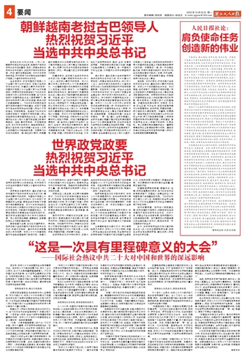 连日来,中共二十大受到国际社会持续高度关注。在中共二十大胜利闭幕之际,海外人士纷纷表示,此次大会具有重要里程碑意义,不仅对中国产生深远影响,也为世界各国携手应对挑战、实现共同发展注入动力。相信在中国共产党坚强领导下,中国将不断以新发展为世界提供新机遇,为推动构建人类命运共同体、建设更加美好世界作出新的贡献。