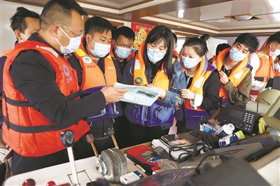 据介绍,开设“船舱课堂”是该镇开展“砺苗”成长行动的缩影,通过开展一线历练、现场教学、结对帮带等形式,帮助新同志尽快进入工作角色,加快成长为渔安好手、实干行家,为滨海新城建设贡献青春力量。图为青年干部在渔船上学习安全检查知识。