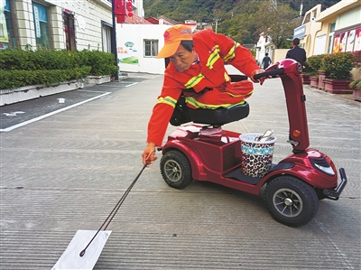 | 包和定坐着轮椅车捡拾垃圾。 通讯员丁益斌 摄 |