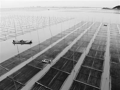 近日,在台州市路桥区金清镇海边,海面上竹排错落有致排列,紫菜养殖户划着小船收割头茬紫菜。近年来,路桥区金清镇在党建引领和乡贤带富下,依托海洋资源,引导海边农民发展“海上菜园”经济,开展紫菜养殖。目前,金清镇共养殖紫菜6000多亩,仅此一项每年就能为群众带来5000多万元的经济收入,走出一条切合当地实际的致富之路,助推乡村振兴。