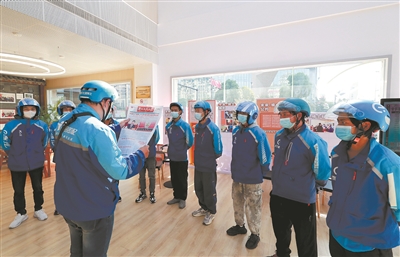 近日,位于杭州市余杭区仓前街道葛巷社区的邻里中心小哥驿站,来自辖区的饿了么外卖配送员班组,正在利用“班前十分钟”学习党的二十大精神。余杭区总工会基层部部长郑敏泉介绍说,接下来将组织小组长带头讲、深入骑手驿站创新讲等多种喜闻乐见的宣讲方式,迅速在新就业形态劳动者群体掀起学习贯彻党的二十大精神热潮。