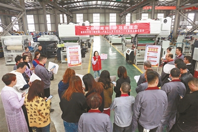 在浙江泰普森实业集团有限公司生产车间,原材料物流部“车间政委”沈斌兵向一线职工传达党的二十大报告中提出的坚持尊重劳动、尊重知识、尊重人才、尊重创造,实施更加积极、更加开放、更加有效的人才政策,鼓励大家立足本职岗位,踔厉奋发、勇毅前行,切实把党的二十大精神转化为履职尽责的实际行动。